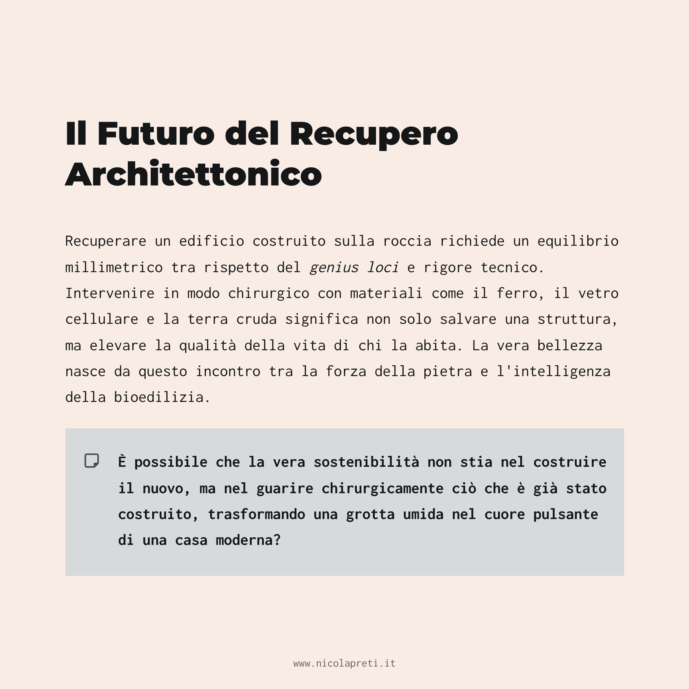 Recuperare un edificio costruito sulla roccia richiede un equilibrio millimetrico tra rispetto del genius loci e rigore tecnico. Intervenire in modo chirurgico con materiali come il ferro, il vetro cellulare e la terra cruda significa non solo salvare una struttura, ma elevare la qualità della vita di chi la abita. La vera bellezza nasce da questo incontro tra la forza della pietra e l'intelligenza della bioedilizia.