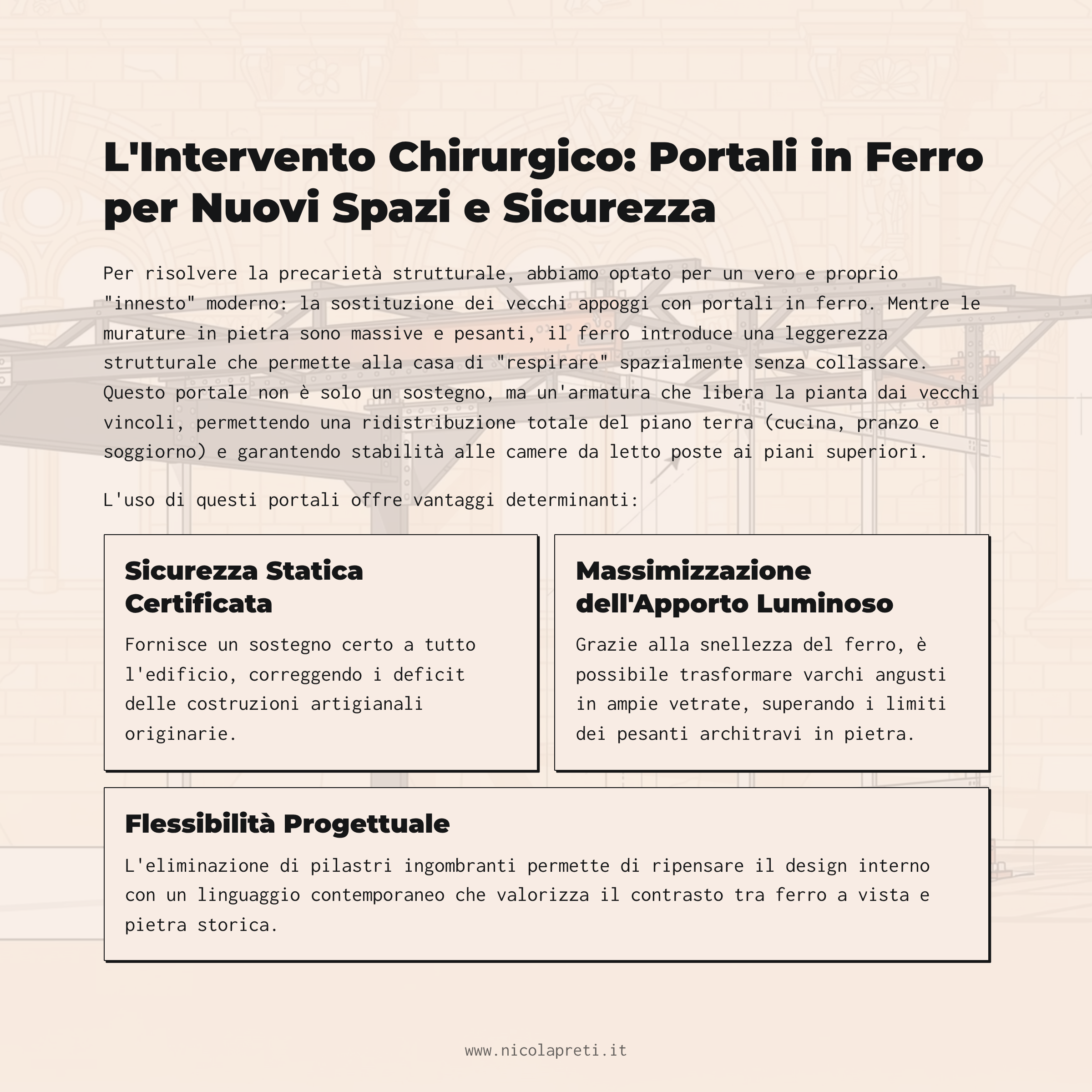 Flessibilità Progettuale: L’eliminazione di pilastri ingombranti permette di ripensare il design interno con un linguaggio contemporaneo che valorizza il contrasto tra ferro a vista e pietra storica.